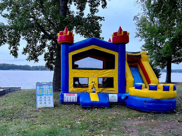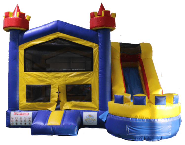 Royal Palace is a fun, eye-catching inflatable that brings big excitement to any party! With bold blue and yellow colors, this bounce house with slide can be used wet or dry, indoors or outdoors, making it perfect for birthday parties, end-of-season sports parties, or any backyard celebration.