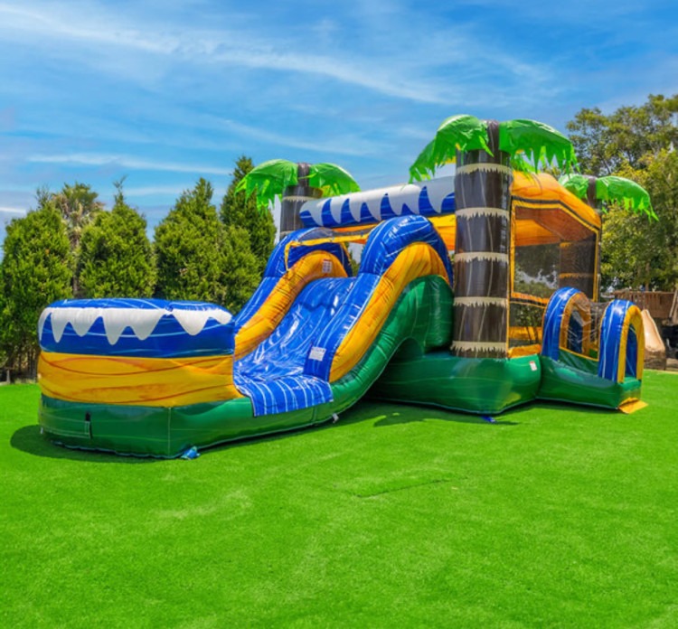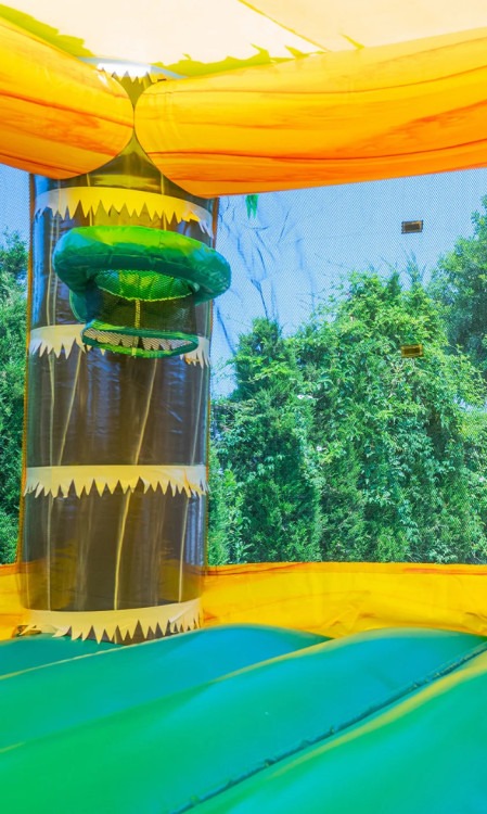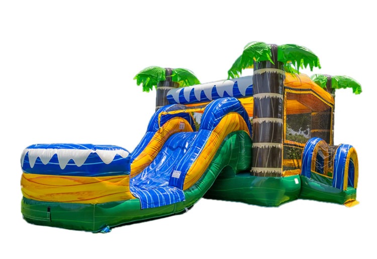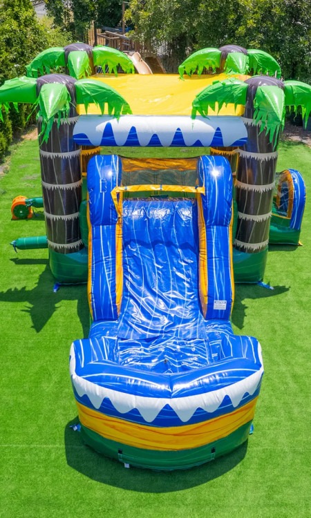 The Paradise Palms Bounce House + Slide Combo (Dry) is the perfect way to cool off with your family and friends together for outdoor fun. Designed for both kids and adults, this inflatable transforms any backyard into a tropical escape. Featuring a large bounce area, an interior basketball hoop, and an exciting slide with splash pad, this combo unit provides hours of entertainment for guests of all ages. Its vibrant green, blue, and yellow marble design makes it a standout attraction at any party or event, adding a lively, tropical touch to your gathering.